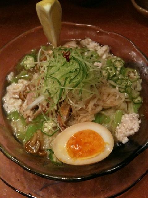 千切りのキュウリ、白髪ネギ、鳥そぼろ、オクラ、なめこ、味玉に鳥チャーシュー