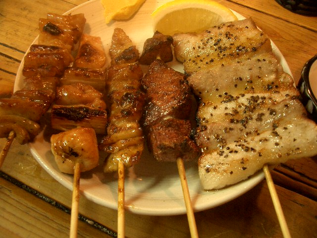 皮・シロ・ネギマ・ハツをタレあと豚バラ、煮込み、番番奴にレモンハイ。