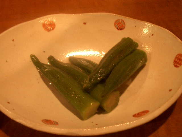 瑞々しいオクラで色はチョットくすんだ様子で口に含むと山葵の香りがパァっと広がります。