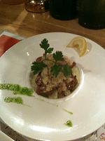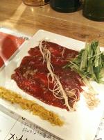 シャキシャキとした水菜を合わせるにくい演出の鯨のカルパッチョ