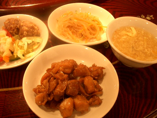 中華スープ、漬物、揚げ物、春雨サラダ、水餃子、生姜風味の鶏肉の煮物
