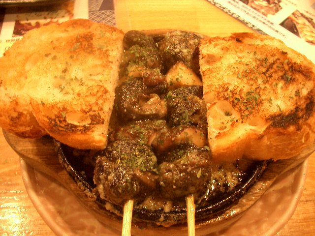 〆には炭火で焼かれたフランスパンにガーリックバターを吸わせてパクリ