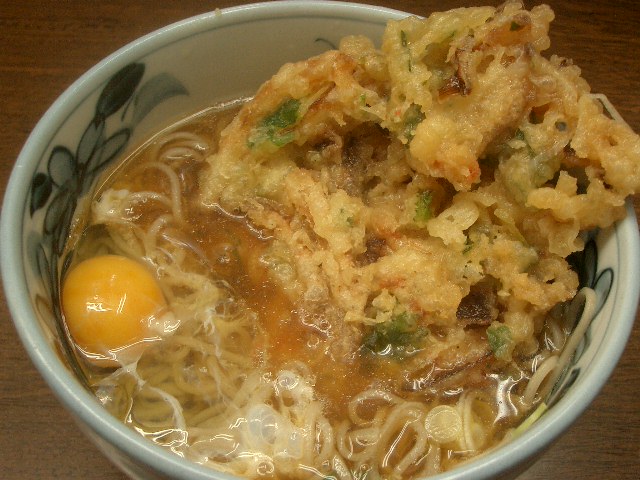 器と同じ位の大きさのかき揚げに生卵が乗ってボリューム満点。